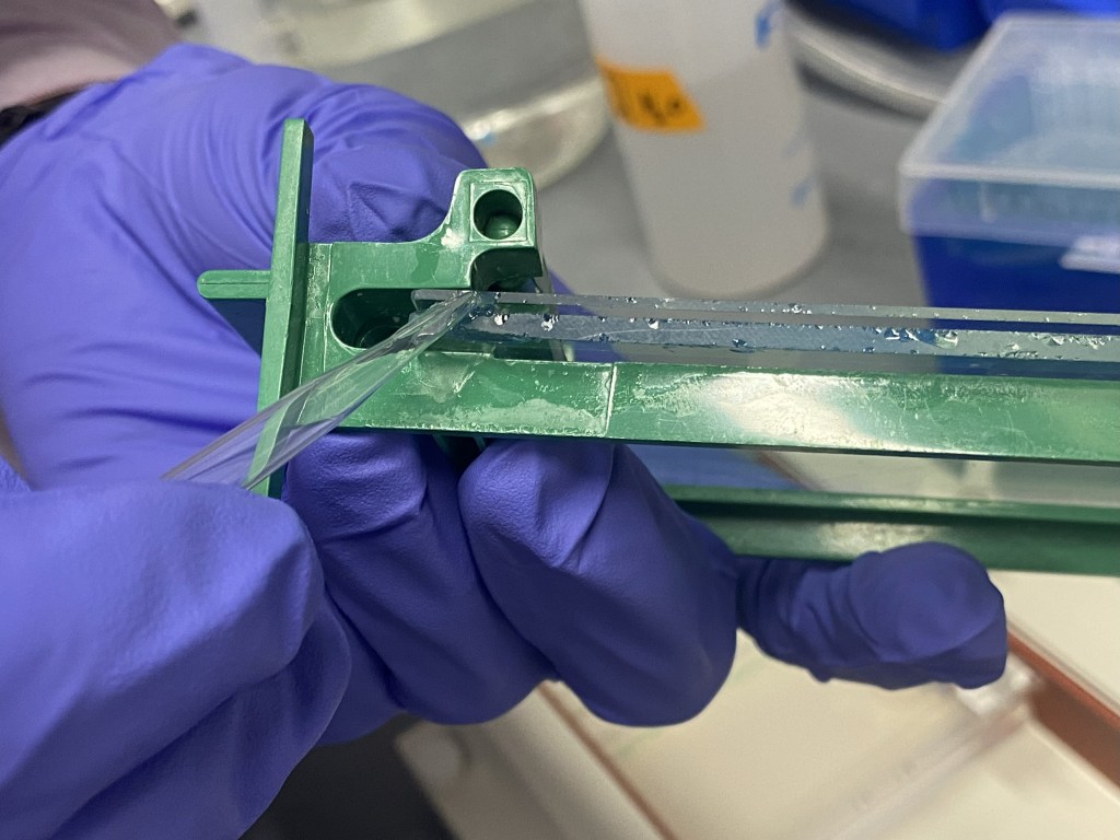 - Put the glass plate on the rubber seal and add the acrylamide solution as normal
